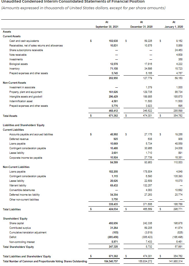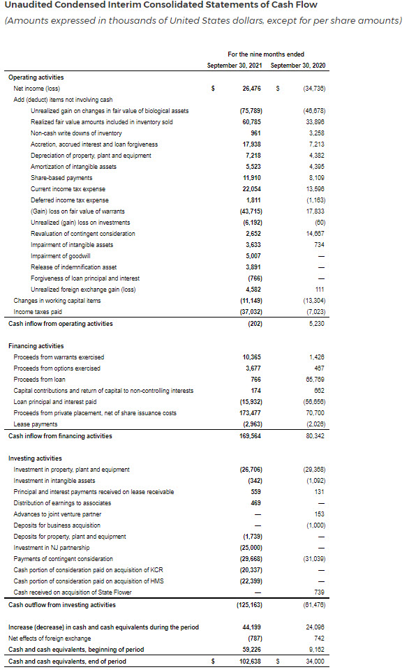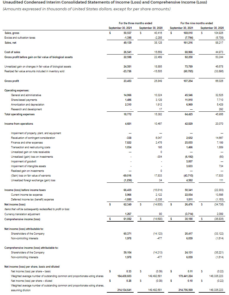 - Announced the acquisition of Gage Growth Corp. (“Gage”) and expect the transaction to close in early 2022, ahead of previous expectations.