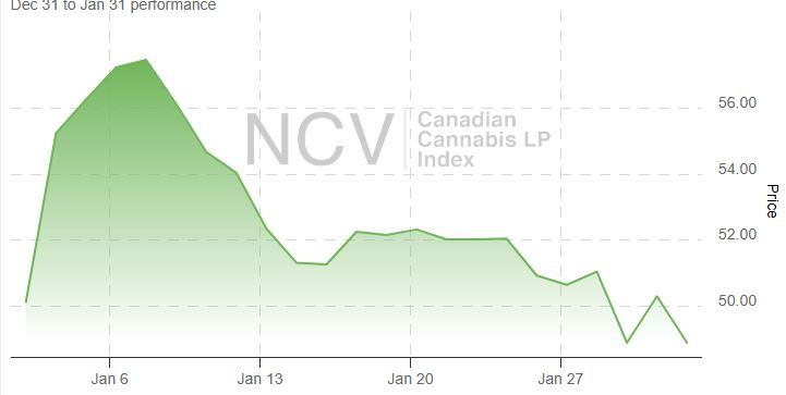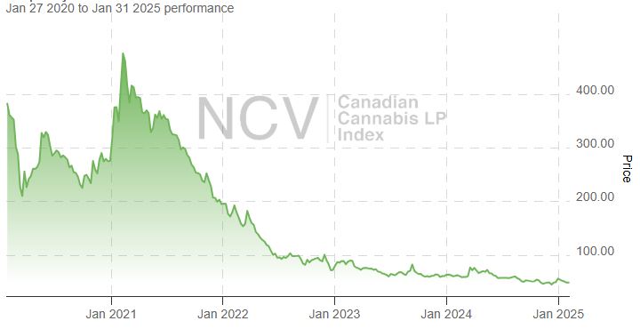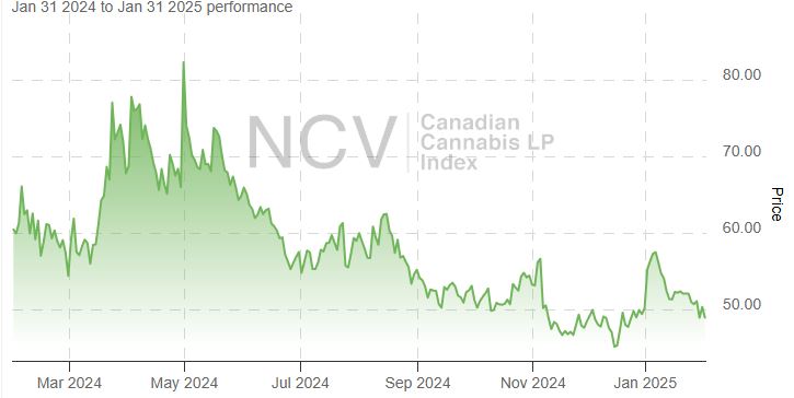 The Canadian Cannabis LP Index had a rough year in 2024, but it ended 2024 with a bounce and began 2025 by dropping 2.5% during January to 48.87: