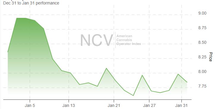 The best performing stock in the index in January was Innovative Industrial Properties (NYSE: IIPR), rising 7.6%. The three other REITs declined. The worst stock was GrowGeneration (NASDAQ: GRWG), declining 17.2%.