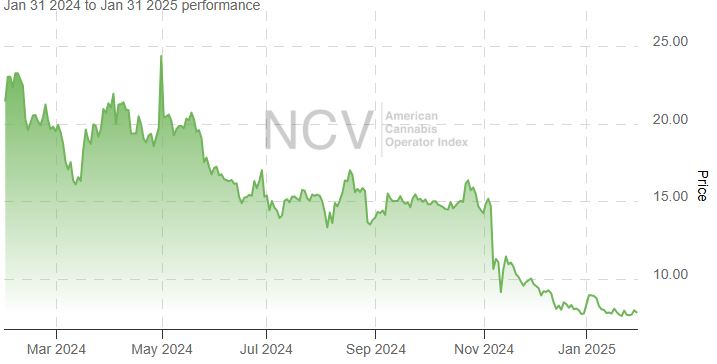 The American Cannabis Operator Index peaked last April on potential rescheduling news and sank for the rest of 2024. In January, it experienced more of the decline, with the index falling 6.2% to 7.84: