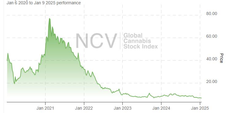 After showing strength into the new year that was followed by further rallying, the New Cannabis Ventures Global Cannabis Stock Index plunged yesterday and is now down 0.3% in 2025. After declining so much in the past almost four years, the drop doesn’t even show yet on the longer-term chart: