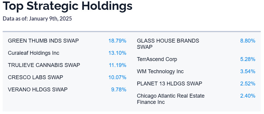 The MJUS ETF currently has 81.15 million shares worth about $66 million, of which only 100K traded yesterday on the news. The Amplify ETF MJ owns 76.59 million of the MJUS shares (94%). MJUS holds mainly MSOs, with four of them in excess of 10% of the ETF: