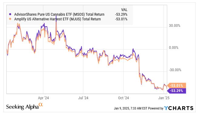MJUS is very similar to AdvisorShares Pure US Cannabis ETF (NYSE Arca: MSOS), which I recently suggested could bounce. My optimism after being so pessimistic about it was premature, as it did post a new all-time low, but that low held yesterday. MJUS has better diversification than MSOS, but it is much smaller and less liquid as well. The two funds have performed similarly over the past year: