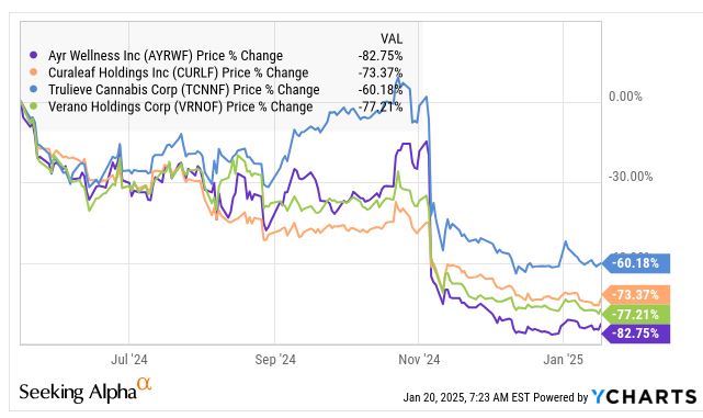 We warned readers on May 17th regarding the MSOs that are big in Florida, as investors seemed overly optimistic. The entire cannabis market has pulled back since then, and the entire group of MSOs is sharply lower, especially after the defeat of the adult-use ballot initiative last week. All four leaders in Florida have declined substantially though 01/17/25: