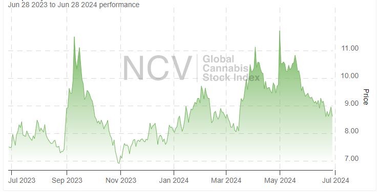 Cannabis stocks, as measured by the Global Cannabis Stock Index, exploded higher in late August on news that the Department of Health and Human Services had recommended to the DEA that it move cannabis from Schedule 1 to Schedule 3, and the move continued into September. October wiped out the entire rally, and November and December saw the market recover some of the losses. In January, the rally continued, but it stalled in February before advancing in March. In April, it soared on the last day to finish the month up 14.7% sequentially at 11.72. Despite the good news from the DEA, the index plunged in May. In June, it moved lower before bouncing, ending down 8.9% to 8.61:
