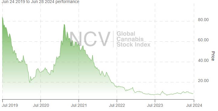 Since the peak in February 2021, the Global Cannabis Stock Index has dropped 90.7% from the 92.48 closing high: