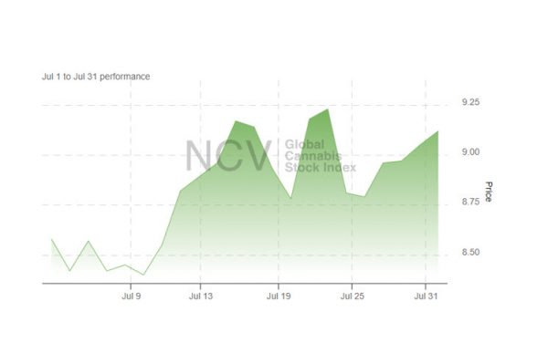 Cannabis stocks, as measured by the Global Cannabis Stock Index, exploded higher in late August on news that the Department of Health and Human Services had recommended to the DEA that it move cannabis from Schedule 1 to Schedule 3, and the move continued into September. October wiped out the entire rally, and November and December saw the market recover some of the losses. In January, the rally continued, but it stalled in February before advancing in March. In April, it soared on the last day to finish the month up 14.7% sequentially at 11.72. Despite the good news from the DEA, the index plunged in May and moved lower in June. In July, it moved higher, ending up 5.9% to 9.12: