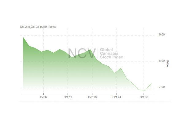 Cannabis stocks, as measured by the Global Cannabis Stock Index, exploded higher in late August on news that the Department of Health and Human Services had recommended to the DEA that it move cannabis from Schedule 1 to Schedule 3, and the move continued into September. October wiped out the entire rally, with the index falling 21.7% to 7.18: