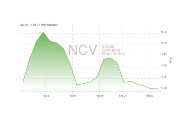 After a big rally in January to begin the year, the Global Cannabis Stock Index lost 6.3% in February to 10.02:
