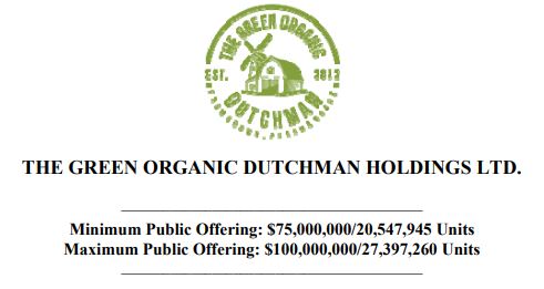 TORONTO, March 14, 2018 /CNW/ – The Green Organic Dutchman Holdings Ltd. (the “Company” or “TGOD”) today announced that it has filed an amended and restated preliminary long form prospectus (the “Prospectus”) with the securities regulatory authorities in each of the provinces of Canada in respect of its previously announced initial public offering of units of the Company (the “Units”). The Prospectus contemplates a minimum offering of $75,000,000 and a maximum offering of $100,000,000 through the issuance of a minimum of 20,547,945 Units and a maximum of 27,397,260 Units (the “Offering”) at a price of $3.65 per Unit.