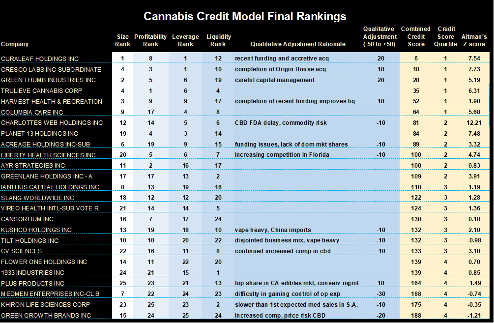 A simple yet robust credit ranking model will be a prized tool for portfolio managers first dipping their toes in the cannabis debt market. I have developed an effective model that is customizable and incorporates data from financial statements and market pricing as well as optional user inputs on qualitative factors like management quality, regulatory environments, business sector risk, and competition.