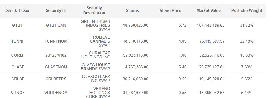 Again, I remain very negative on MSOS. I wrote about it here last in late May, saying that it was at risk, and it has not changed in price since then. The current exposure to the Big 5 totals 80.6%, and its fourth-largest position, GLASF, is 7.6%: