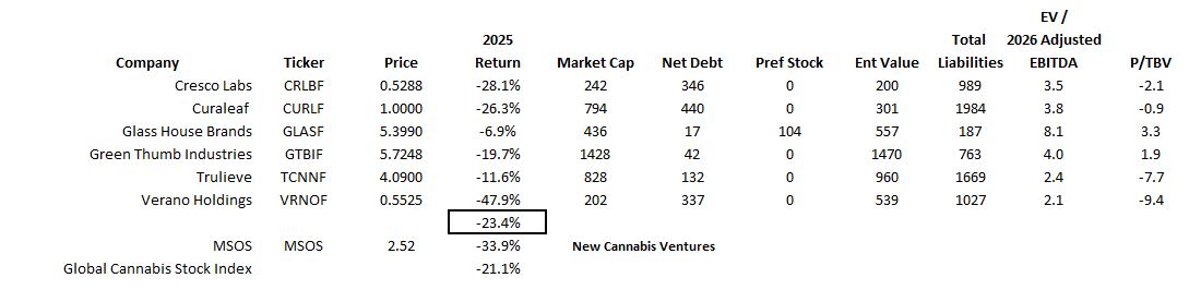 Looking at the Big 5 MSOS, which include Cresco Labs, Curaleaf, GTI, Trulieve and Verano, and Glass House, which is in the index, they seem very cheap. If 280E remains in place, though, there will likely be some financial challenges for several of them. There have been several MSOs that have already experienced financial challenges, and one Tier 2 name, AYR Wellness, faces them currently. That stock is down 67% in 2025.