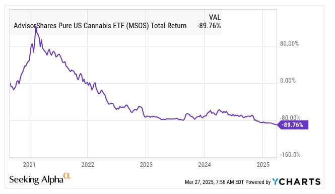 I have been pretty negative for quite some time on MSOS, though I did become more favorably inclined due to the very large drop since the elections in November. This was a mistake! Even here, in a newsletter article, I suggested that MSOS could bounce. I shared an article on Seeking Alpha this past weekend discussing how much it is down, but I concluded that MSOS could keep dropping.