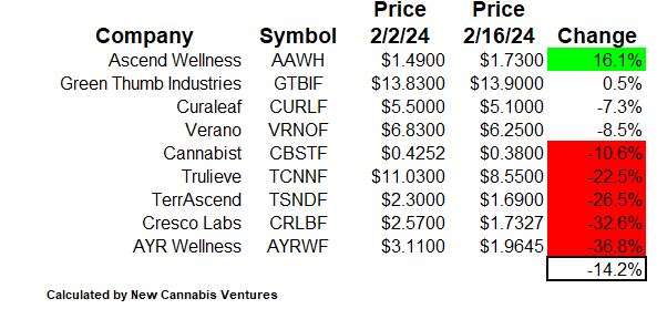 In the past two weeks, the average decline has been 14%,with 5 of the 9 down double-digit. Of course, they are up a lot still. The main driver has been and remains the potential rescheduling of cannabis by the DEA, which was announced in late August. The investment community has no timeline to work with, and it’s not clear that cannabis will be rescheduled to Schedule 3, which is what is required for 280E taxation to go away.
