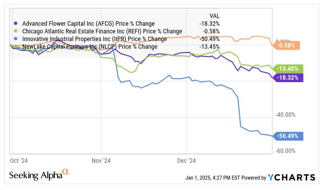 Last week, I pointed out how sharply Innovative Industrial Properties (NYSE: IIPR) had declined after the revelation on 12/20 that its largest tenant, PharmaCann, a private MSO, had failed to pay some of the December rents. The stock did pay its previously scheduled dividend of $1.90 per share, going ex-dividend on 12/31, but it also has dropped in price by $3.71 since the day before Christmas. The stock’s price fell 33.9% in 2024, including a very large drop in Q4 of 50.5%. There are three other cannabis REITs, and none fell by nearly as much: