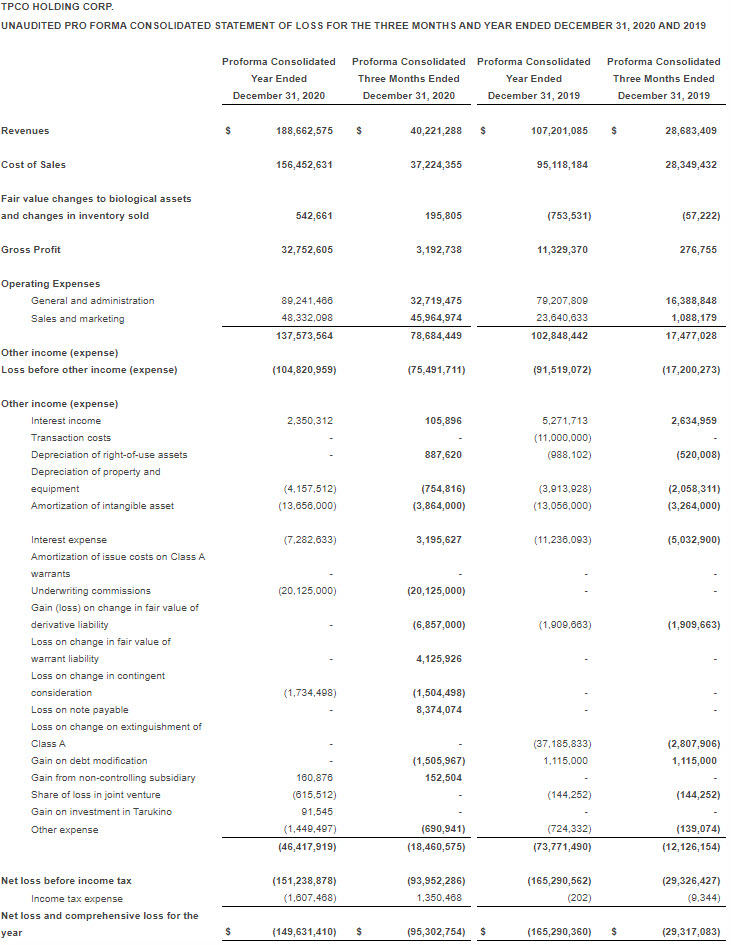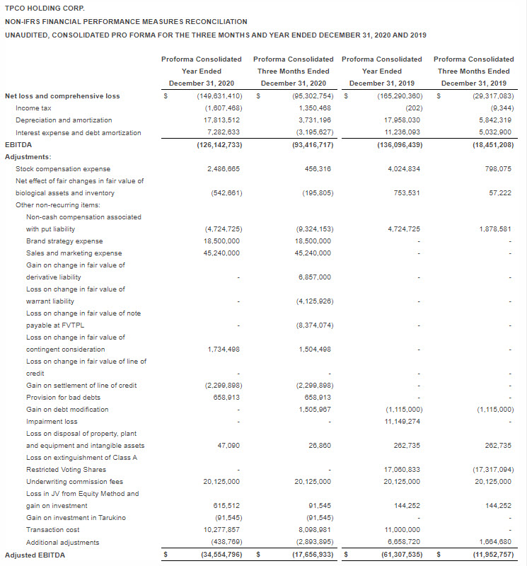 The Company cautions investors that the consolidated pro forma financial statements (i.e. which consolidates TPCO Holding, Caliva, LCV and SISU) as of December 31, 2020 included in the BAR and provided as exhibits to this press release are unaudited. The entity level financial statements for Caliva, LCV and SISU as of December 31, 2020 which are included in the BAR are audited. Please refer to TPCO’s MD&A for additional detail and discussion on the Company’s results from operations.