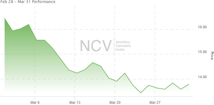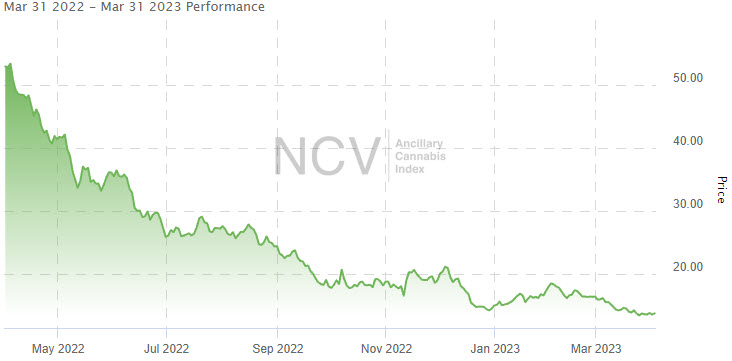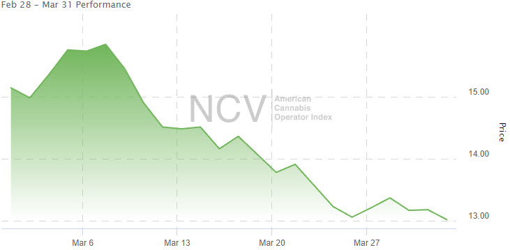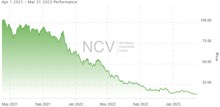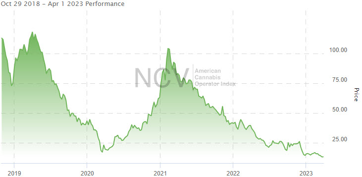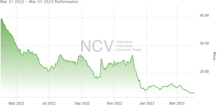 The American Cannabis Operator Index was one of the weakest parts of the market in January, but it was relatively strong in February when it was unchanged from January. In March, the index plunged 14.0% to 13.02, leaving it down 8.6% in 2023: