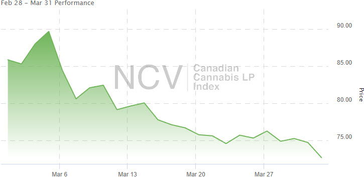 The Canadian Cannabis LP Index was very strong to begin the year, rising 19.4% in January and falling just slightly in February, but the index plunged 15.4% in March to 72.65: