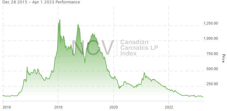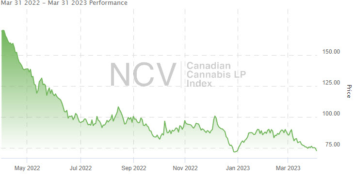 Down 22.9% in Q4 after a collapse in December, it was down 65.8% in 2022 to 14.25, slightly ahead of the Global Cannabis Stock Index. Over the past year, the index has declined 66.6%: