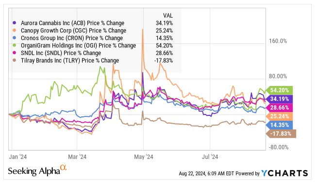 I have written positively about the Canadian LPs before, but this tended to be as an alternative to the overly-hot MSOs, which ran up too much and too quickly on the potential rescheduling news. I no longer worry too much about the MSOs and have slightly more exposure to that sub-sector in my model portfolio at 32.4%. Our index that captures the MSOs, the American Cannabis Operator Index, is up only 3.0% in 2024.