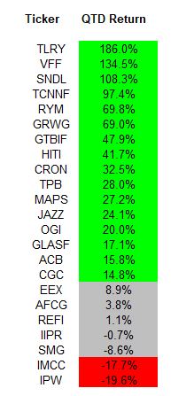 There are 23 stocks currently in the Global Cannabis Stock Index, and they are now up quarter-to-date 39.2%. The range of returns is from -19.6% to +186.0%:
