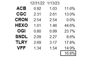 Cannabis stocks have shot up in the first two weeks of the year, and the Canadian LP market is leading the way. The New Cannabis Ventures Canadian Cannabis LP Index has rallied 20% in two weeks. It was down 62.8% in 2022, less than the overall market, but still a big drop.