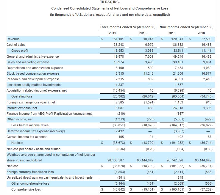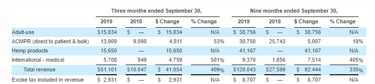 - Revenue Increased 409% to $51.1 (C$67.8) Million in the Third Quarter of 2019 Compared to the Prior Year Period