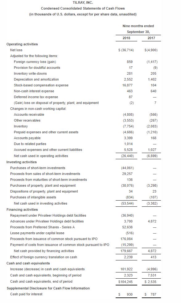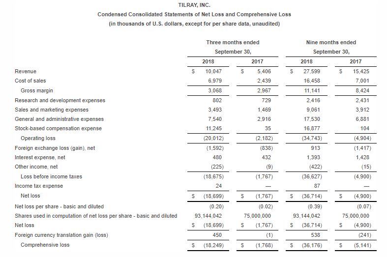 Tilray, Inc. Reports Third Quarter 2018 Earnings