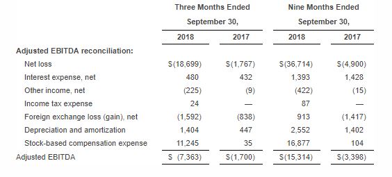 - Net loss for the quarter was $18.7 million or $0.20 per share compared to $1.8 million or $0.02 per share for the third quarter of 2017. Net loss includes non-cash stock based compensation charges of $11.2 million compared to a $35 thousand charged in the prior year period. Excluding non-cash compensation, net loss was $7.5 million or $0.08 per share. Adjusted EBITDA was a loss of $7.4 million compared to a loss of $1.7 million the third quarter last year. The increased net loss and Adjusted EBITDA declines were primarily due to the increase in operating expenses related to continued growth, expansion of international teams, and costs related to financing and the initial public offering (“IPO”).