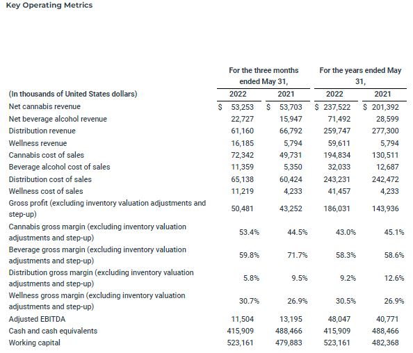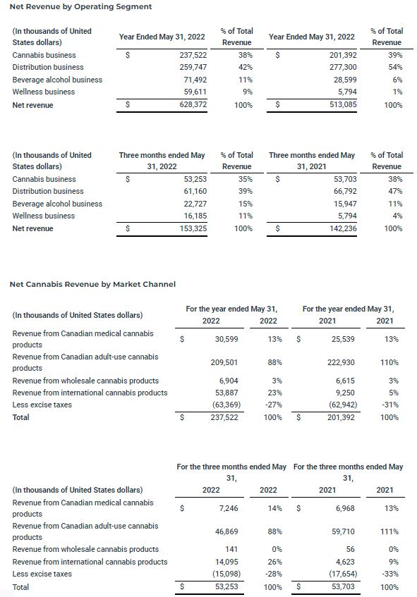 - Net revenue increased 22% to $628.4 million during fiscal 2022 from $513.1 million in the prior fiscal year. The increase was driven by 17.9% growth in cannabis net revenue to $237.5 million, a 150.0% increase in beverage alcohol net revenue of $71.5 million, and a 928.8% increase in wellness net revenue to $59.6 million. On a constant currency basis, net revenue increased by 29%.
