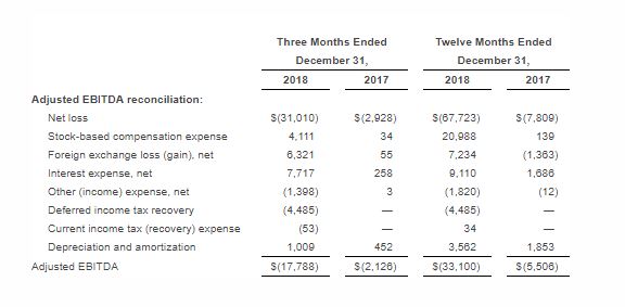 - Net loss for the year was $67.7 million, or $0.82 per share, compared to $7.8 million, or $0.10 per share, for 2017. Net loss includes non-cash stock-based compensation charges of $21.0 million compared to a $0.1 million charge in the prior-year. Adjusted EBITDA was a loss of $33.1 million compared to a loss of $5.5 million the prior year. The increased net loss and Adjusted EBITDA declines were primarily due to the increase in operating expenses related to continued growth, expansion of international teams, and costs related to financings and the initial public offering (“IPO”). See “Use of Non-U.S. GAAP Financial Measures.”