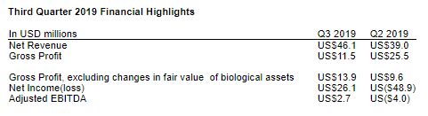 Revenue for the third quarter of 2019 was US$46.1M, an increase from US$39M in the second quarter of 2019. Compared to the second quarter of 2019, revenue increased 18%. On a sequential basis, growth over the second quarter of 2019 primarily reflects growth at the Company’s licensed cultivation facilities in Massachusetts.