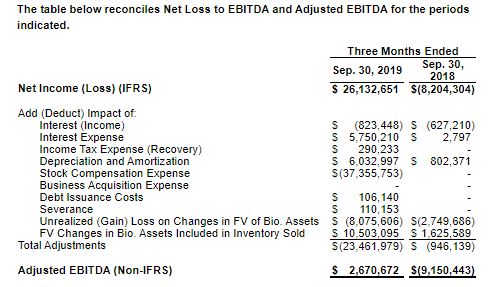 EBITDA and Adjusted EBITDA are financial measures that are not defined under IFRS. The Company uses these non-IFRS financial measures, and believes they enhance an investor’s understanding of the Company’s financial and operating performance from period to period, because they excludes certain material non-cash items and certain other adjustments management believes are not reflective of the Company’s ongoing operations and performance. The Company calculates EBITDA as net income (loss), plus (minus) income taxes (recovery), plus (minus) interest expense (income), plus depreciation and amortization expense. Adjusted EBITDA excludes certain one-time non-operating expenses, as determined by management, including stock compensation expense, unrealized gain/loss on changes in fair value of biological assets, fair value changes in biological assets included in inventory sold and business acquisition expense.