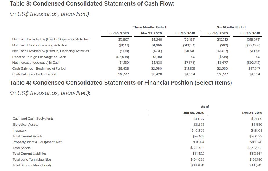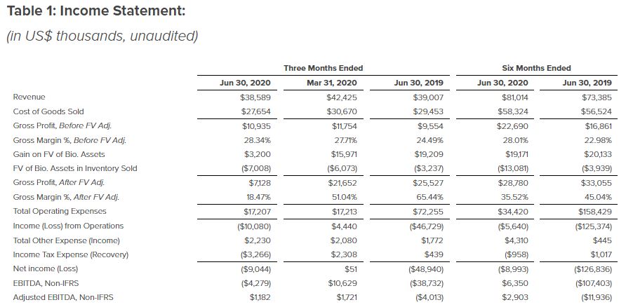 EBITDA and Adjusted EBITDA are financial measures that are not defined under IFRS. The Company uses these non-IFRS financial measures, and believes they enhance an investor’s understanding of the Company’s financial and operating performance from period to period, because they exclude certain material non-cash items and certain other adjustments management believes are not reflective of the Company’s ongoing operations and performance. The Company calculates EBITDA as net income (loss), plus (minus) income taxes (recovery), plus (minus) finance expense (income), plus depreciation and amortization expense. Adjusted EBITDA excludes certain one-time, non-cash or non-operating expenses, as determined by management, including stock compensation expense, business acquisition expense, debt issuance costs, severance, unrealized (gain) loss on changes in fair value of biological assets and fair value changes in biological assets included in inventory sold.