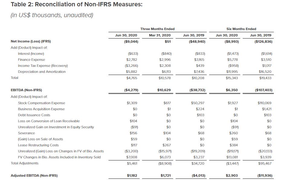 Adjusted EBITDA is reconciled to Net Loss below as well as the section labelled “Reconciliation of Net Income (Loss) to Non-IFRS Measures” in the Management Discussion and Analysis of the Company for the quarter ended on June 30, 2020, which is available on the Company’s SEDAR profile at www.sedar.com.