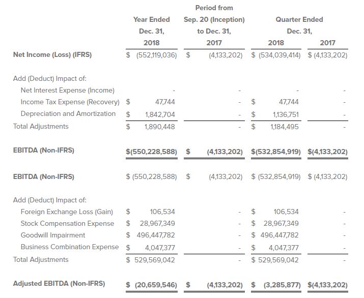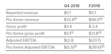 Adjusted EBITDA is reconciled to Net Loss in the Management Discussion and Analysis of the Company for the year ended on December 31, 2018, which is available on the Company’s SEDAR profile at www.sedar.com. Pro Forma Adjusted EBITDA is reconciled to [Net Loss] in the table that follows: