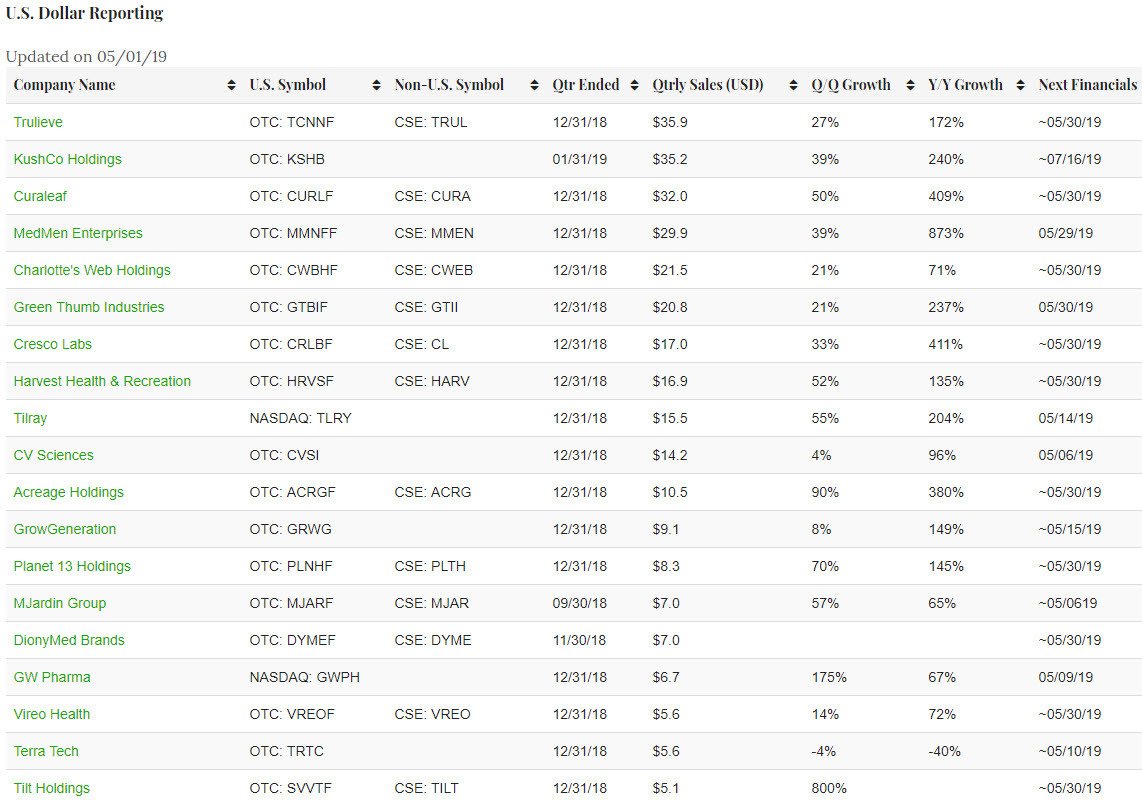 May will be quite busy, with many companies filing quarterly reports, including, among the largest revenue-generators, Trulieve (CSE: TRUL) (OTC: TCNNF), Curaleaf (CSE: CURA) (OTC: CURLF), MedMen Enterprises (CSE: MMEN) (OTC: MMNFF), Charlotte’s Web (CSE: CWEB) (OTC: CWBHF), Green Thumb Industries (CSE: GTII) (OTC: GTBIF), Cresco Labs (CSE: CL) (OTC: CRLBF), Harvest Health & Recreation (CSE: HARV) (OTC: HRVSF), Tilray (NASDAQ: TLRY), CV Sciences (OTC: CVSI) and Acreage Holdings (CSE: ACRG) (OTC: ACRGF). MedMen, which has scheduled a call for May 29th, has already pre-announced Q3 sales of US$36.6 million.Other companies with scheduled calls include CV Sciences, Greenlane, GTI, GW Pharma and Tilray. MJardin Group (CSE: MJAR) (OTC: MJARF) is late on its 2018 financials but has indicated that it will file by May 6th.