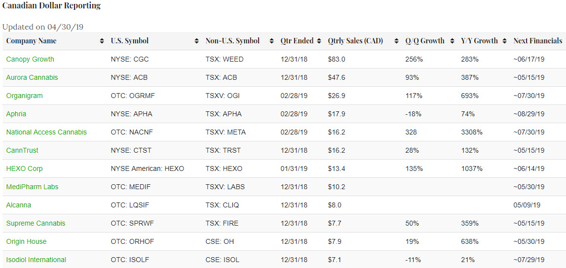 Of the companies that report in Canadian dollars and that generated the equivalent of more than US$10 million, Organigram(TSXV: OGI) (OTC: OGRMF), Aphria (TSX: APHA) (NYSE: APHA) and National Access Cannabis (TSXV: META) (OTC: NACNF) reported financials in the back part of April. The Organigram report for its fiscal Q2 allowed it to advance ahead of Aphria, which reported its fiscal Q3. Note that the overall revenue generated by Aphria, which is boosted by non-cannabis revenue, was much higher. Its cannabis-related revenue actually declined from its Q2 levels. The vast majority of the revenue from National Access is related to its retail cannabis stores.