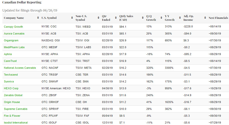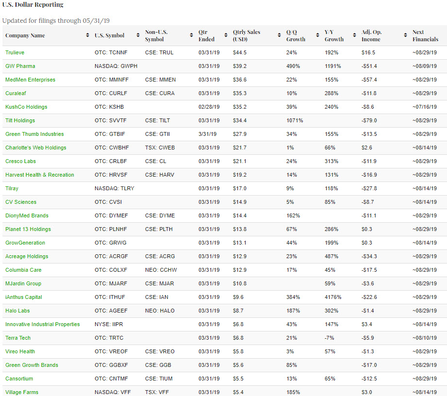 41 companies currently qualify for inclusion, with 26 filing in U.S dollars and 15 in the Canadian currency. Since our last report at the end of May, we have added Canadian retailer Fire & Flower (TSXV: FAF) (OTC: FFLWF). We expect to add more companies in the coming months. We are not able to include Elixinol Global (ASX: EXL) (OTC: ELLXF) and Greenlane (NASDAQ: GNLN), which would otherwise qualify but don’t break out their cannabis-related revenue.