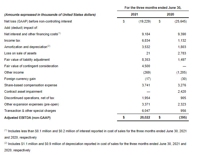 This reflects the Adjusted EBITDA of Harvest for the fiscal quarter ended June 30, 2021. The most directly comparable GAAP financial measure for Adjusted EBITDA is Net Income (loss), which for Harvest for the fiscal quarter ended June 30, 2021 was $(19.229) million. The following is a reconciliation of Adjusted EBITDA to Net Income (loss) for Harvest for the fiscal quarter ended June 30, 2021.