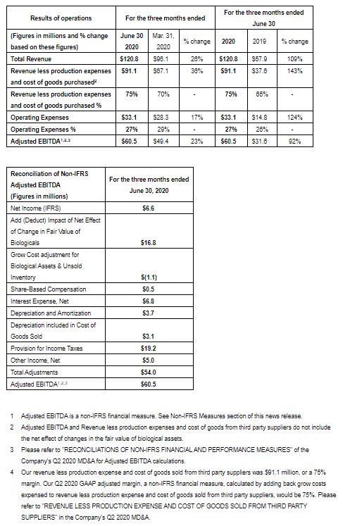 Adjusted EBITDA is not a recognized performance measure under IFRS, does not have a standardized meaning and therefore may not be comparable to similar measures presented by other issuers. Adjusted EBITDA is included as a supplemental disclosure because Management believes that such measurement provides a better assessment of the Company’s operations on a continuing basis by eliminating certain material non-cash items and certain other adjustments Management believes are not reflective of the Company’s ongoing operations and performance. Adjusted EBITDA has limitations as an analytical tool as it excludes from net income as reported interest, tax, depreciation, non-cash expenses, RTO expense, other income, grow cost expensed for biological assets and unsold inventory, and the non-cash fair value effects of accounting for biological assets and inventories. Because of these limitations, Adjusted EBITDA should not be considered as the sole measure of the Company’s performance and should not be considered in isolation from, or as a substitute for, analysis of the Company’s results as reported under IFRS. The most directly comparable measure to Adjusted EBITDA calculated in accordance with IFRS is operating income (loss). See “Reconciliation of non-IFRS measures” in the Company’s Management’s Discussion and Analysis for the quarter ended March 31, 2020 for additional information.