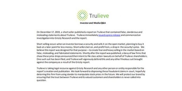 TALLAHASSEE, Fla., Jan. 10, 2020 (GLOBE NEWSWIRE) — Trulieve Cannabis Corp. (“Trulieve” or the “Company”) (CSE: TRUL) (OTCQX: TCNNF), a leading and top-performing cannabis company in the United States, announced today that it has filed a lawsuit in Florida state court against GRIZZLY RESEARCH LLC (“Grizzly”) alleging, among other claims, defamation for publicly disseminating false and libelous statements about Trulieve to manipulate the stock price and further its own financial interests. On December 17, 2019, Grizzly published a false, misleading, and unsubstantiated report. The Complaint demonstrates the defamatory, false and misleading nature of the report. The Company posted a summary of these claims and responses on their website.