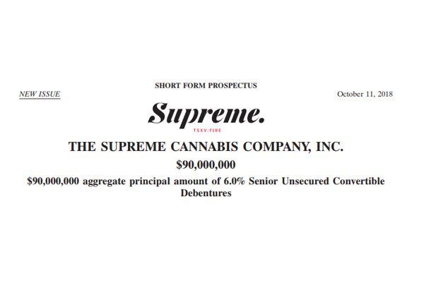 TORONTO, Oct. 19, 2018 /CNW/ – The Supreme Cannabis Company, Inc. (“Supreme Cannabis” or the “Company”) (TSXV: FIRE) (OTCQX: SPRWF) (FRA: 53S1), is pleased to announce that, further to its news release dated September 27, 2018, the Company has completed its bought deal offering for gross proceeds of $100 million, including the exercise in full of the underwriters’ over-allotment option (the “Offering”), comprised of 6.0% senior unsecured convertible debentures (the “Debentures”) of Supreme Cannabis at the issue price of $1,000 per Debenture, with a syndicate of underwriters, co-led by GMP Securities L.P. and BMO Capital Markets, and including Cormark Securities Inc., Eight Capital, Beacon Securities Limited and P.I. Financial Corp.