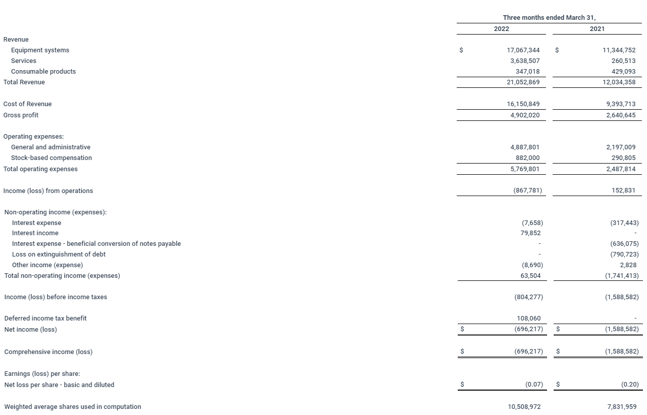 - Project backlog of contractually committed equipment and service orders with deposits received of $22.0 million as of March 31, 2022
