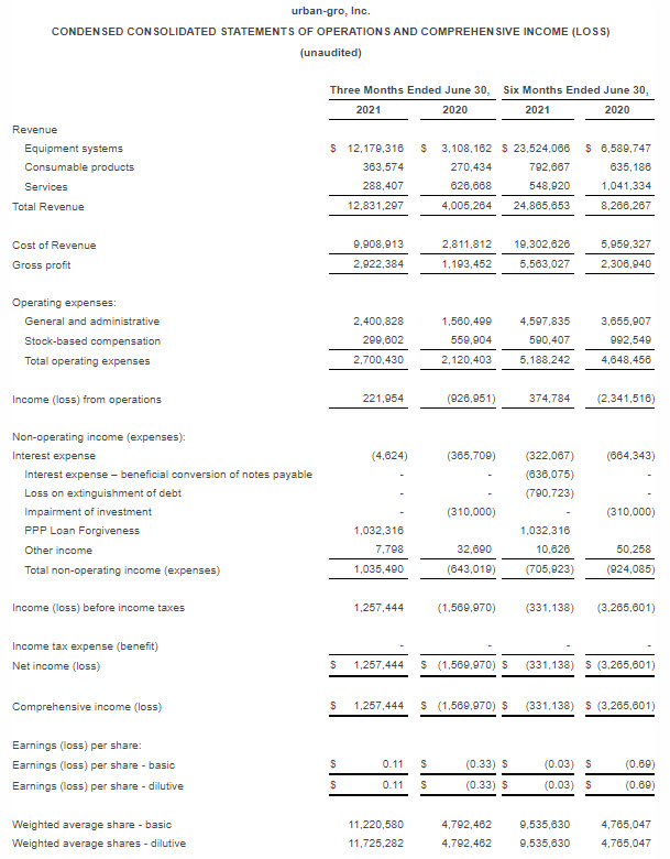 - In the second quarter 2021, urban-gro achieved profitability, generating net income of $1.3 million, or $0.11 per share, compared to a net loss of ($1.6) million in Q1 2021 or ($0.20) per share, and a net loss of ($1.6) million in Q2 2020 or ($0.33) per share, which is a year-over-year improvement of $2.9 million, driven by increased revenues, gross profits and debt forgiveness.