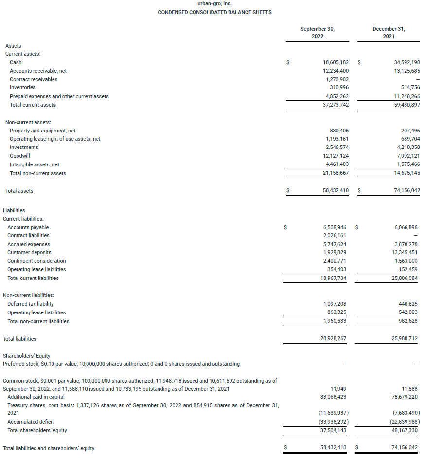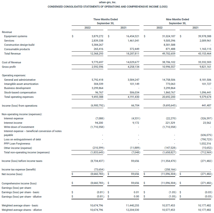LAFAYETTE, Colo., Nov. 10, 2022 (GLOBE NEWSWIRE) — urban-gro, Inc. (Nasdaq: UGRO) (“urban-gro” or the “Company”), an integrated professional services and design-build firm offering solutions to the Controlled Environment Agriculture (“CEA”) and commercial sectors, today reported third quarter financial results.