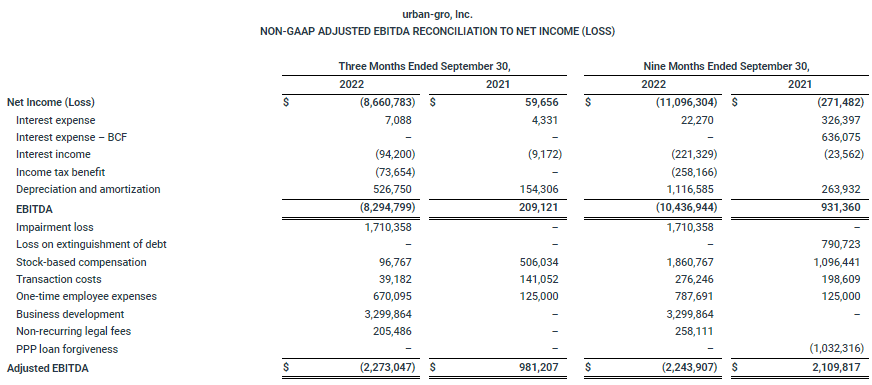 We define Adjusted EBITDA as net income (loss) attributable to urban-gro, Inc., determined in accordance with GAAP, excluding the effects of certain operating and non-operating expenses including, but not limited to, interest income and expense, income taxes, depreciation of tangible assets, amortization of intangible assets, impairment of investments, unrealized exchange losses, debt forgiveness and extinguishment, stock-based compensation expense, one-time and non-recurring expenses, and acquisition costs that we do not believe reflect our core operating performance. We use Adjusted EBITDA as a measure of our operating performance. Adjusted EBITDA is a supplemental non-GAAP financial measure, and it is not a substitute for net income (loss), income (loss) from operations, cash flows from operating activities or any other measure prescribed by GAAP.