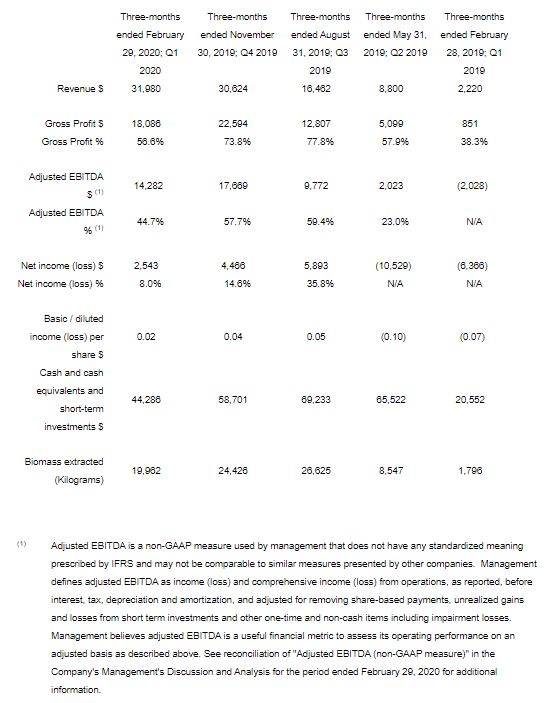 The following table of financial highlights is presented in thousands of Canadian dollars, except per share and biomass extracted amounts.