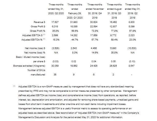 The following table of financial highlights is presented in thousands of Canadian dollars, except per share, biomass extracted and number of SKUs manufactured amounts.